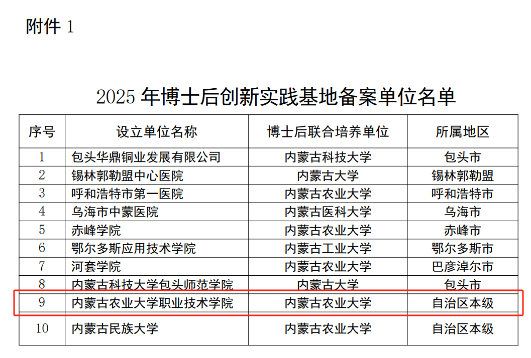 近日,内蒙古自治区人力资源和社会保障厅印发《关于公布2025年度内蒙古自治区博士后创新实践基地建设单位名单的通知》,内蒙古农业大学职业技术学院获准设立内蒙古自治区博士后创新实践基地,标志着学院在高层次人才平台建设方面取得突破,整体办学水平与科研创新实力获得认可。