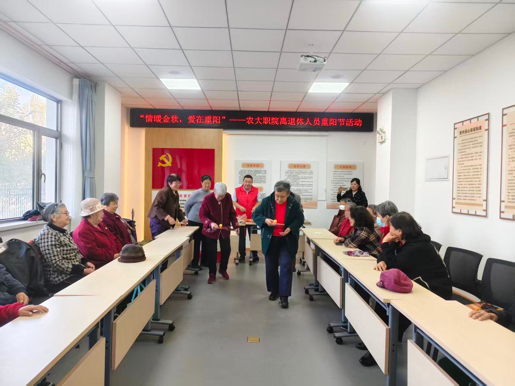 金秋送爽,丹桂飘香。为弘扬中华民族尊老、敬老、爱老、助老的传统美德,丰富我院离退休教职工的精神文化生活,在一年一度的重阳佳节来临之际,学院人事处离退休人员管理科于10月29日在学院社区活动室精心组织举办了“情暖金秋,爱在重阳”主题庆祝活动。学院居住的退休老同志欢聚一堂,共度佳节。